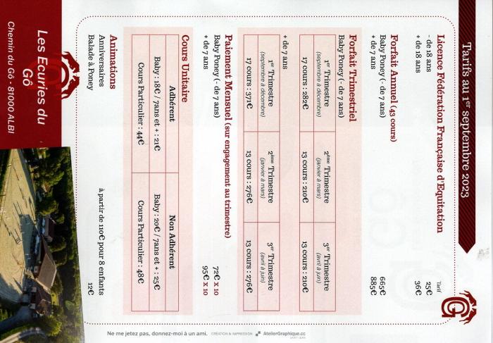 30 chevaux et poneys adaptés permettent à chacun de progresser à son rythme et selon son envie, jusqu’à la compétition. 43 cours à l’année, y compris pendant les vacances scolaires. Compétition Club et Poney Occitanie Tour Club, Championnat de France Lamotte-Beuvron Club, Championnats de France Amateur. Les cours sont encadrés par une monitrice expérimentée et diplômée d’état. Elle pourra vous faire découvrir une multitude d’activités, du loisir aux sorties en compétition CSO, CCE et DRESSAGE.